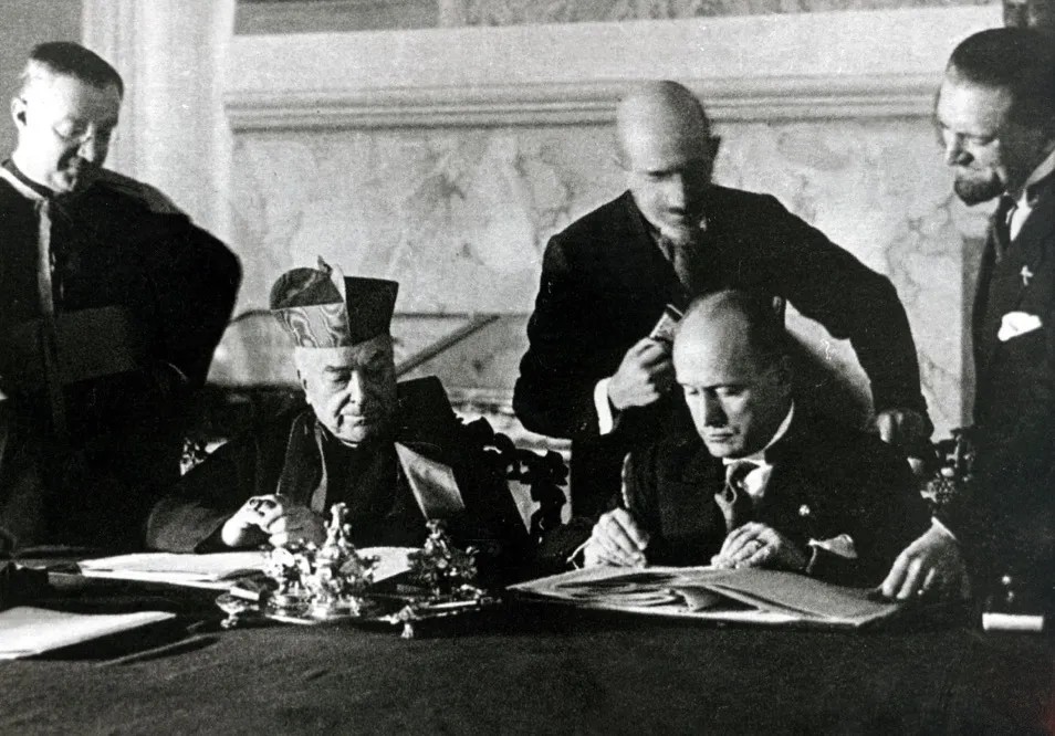 贝尼托·墨索里尼(Benito Mussolini)和彼得罗·加斯帕里(Pietro Gasparri)枢机主教签署《拉特兰协定》