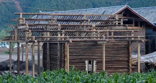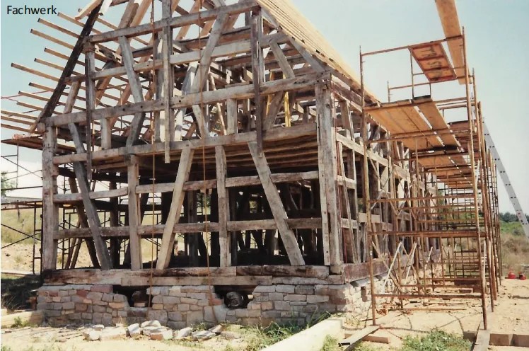 第二组对比是穿斗式建筑和欧洲特色的Fachwerk建筑的对比。Fachwerk是一种广泛分布于欧洲西部和北部的半木框架结构的建筑,集中于德国、法国的平原地区,南至西班牙,北至挪威,东至土耳其都有这种建筑样式(但除了Fachwerk,欧洲还有其他半木框架结构的建筑,因此不能简单地以“欧洲半木构架”来作为这个词的汉译)。穿斗式建筑和Fachwerk建筑有许多相似之处,尤其是在结构和建造方式上,但二者也有一项显著的差异:欧洲的Fachwerk大量使用斜撑,而穿斗式建筑没有斜撑。斜撑对于Fachwerk结构非常重要,以至于在德语中对于斜撑有各种各样的称呼,乃至将斜撑纳入外立面的设计中,而由于斜撑在建筑中形成了稳定的三角形结构,Fachwerk建筑不需要依赖建筑节点刚度提供稳定性,可以广泛地运用木钉这种本身容易旋转的连接方式;与之相对,穿斗式建筑中由于没有斜撑,无法利用三角形的稳定性,所以要求节点更加稳定和精确。简言之,为了实现房屋的安全稳定,欧洲建筑采用特定的结构形式(三角形的几何关系),中国建筑则更多采用构造(榫卯)。这种区别与建筑材料也有关系:欧洲建筑常用橡木,这是一种硬质、生长周期长、难以加工、不燃烧的木材,为了加工橡木,欧洲工匠发展出了大型的木工锯和十字斧,亚洲仅有凉山彝族使用类似的大型工具,这是与该地区特有的营造相匹配的;穿斗式建筑则大量使用杉木,其质地软、生长快、易于加工,在施工过程中可以直接把构件挤到榫洞里,也可以大量打洞,这种加工手法在橡木上是难以想象的。值得注意的是,现已出土的汉代明器中,相当一部分使用了斜撑,这说明在掌握高效的打洞技术之前,中国建筑曾经也大量使用斜撑,然而随着穿斗技术的成熟,中国匠人自觉地摒弃了斜(通“邪”)柱,选择了横平竖直(“正”)的结构和节点,来实现自身对宇宙秩序的认知和建筑结构的统一;另一方面,西方世界对于三角构架的力学特征的挖掘,使建筑学走向了结构科学,人们得以造出更高、更大、更强的建筑。刘老师曾用德文Fachwerk ohne Streben形容穿斗式建筑,由于Streben一词多义,这一短语可同时表达“没有斜撑”或“没有野心”的半木结构建筑,这重双关实际上回答了“中国传统建筑为什么没有走向结构科学”这一建筑学版的李约瑟问题:中国建筑自觉放弃了斜撑,放弃将宏大的建筑规模作为唯一追求,转而追求建筑结构与宇宙观念的统一,即前面所说的“同构”。