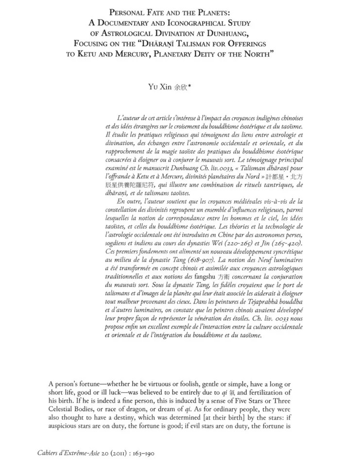 Yu Xin. “Personal Fate and the Planets: A Documentary and Iconographical Study of Astrological Divination at Dunhuang, Focusing on the Dhāraṇī Talisman for Offerings to Ketu and Mercury, Planetary Deity of the North.” Cahiers d'Extrême-Asie 20 (2011): 163-190.
