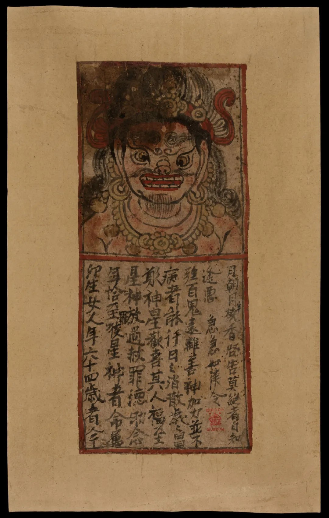 第一件文献Ch.lvi.0033,最初被著名敦煌佛教艺术史研究专家韦陀教授定名为“北方神星·计都星像护符”,英文翻译为“Talisman of the Pole-star”,但“Pole-star”意为“北极星”,这与“北方神星”的意涵并不相同。此文献上半部分由神像与榜题构成。左侧榜题作: