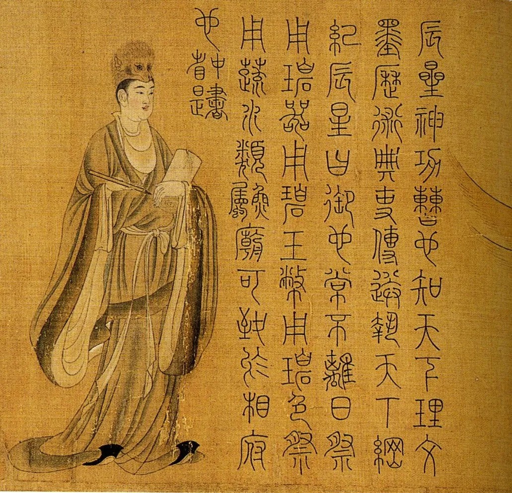 结合西北方言语音特点,“神星”应校读为“辰星”,即水星,而非北极星。左侧所绘图像为唐代妇女形象,身着红色宽肩大衣,内穿裙装,右手执笔,左手执札。右侧为站于云端的披发力士形象,对应榜题是: