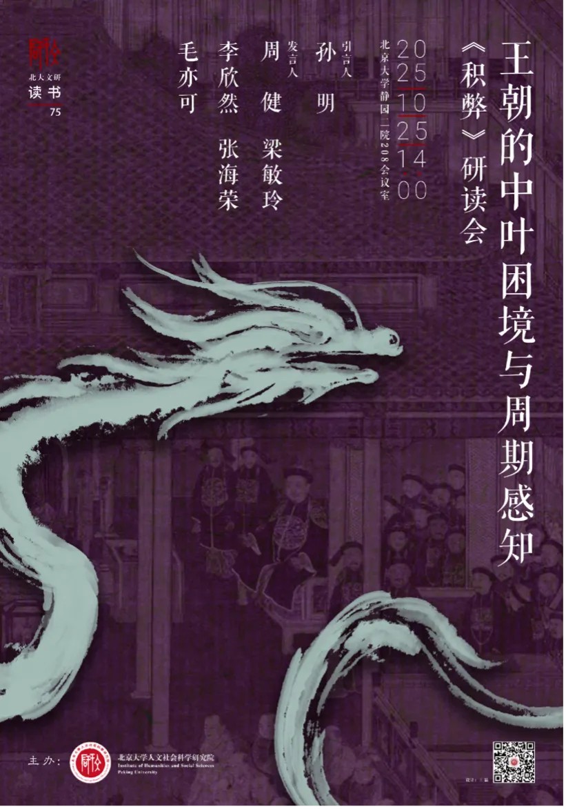 2025年10月25日下午,“文研读书”第75期“王朝的中叶困境与周期感知——《积弊》研读会”在北京大学静园二院208会议室举行。《积弊》作者,北京大学政府管理学院长聘副教授孙明作引言。清华大学历史系副教授李欣然、暨南大学历史学系副教授梁敏玲、北京大学历史学系长聘副教授毛亦可、北京大学历史学系长聘副教授张海荣、复旦大学历史学系副教授周健参与讨论。