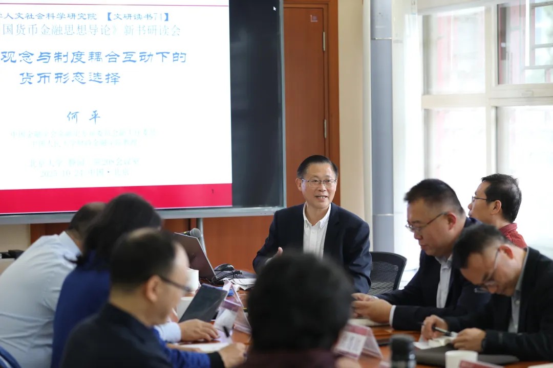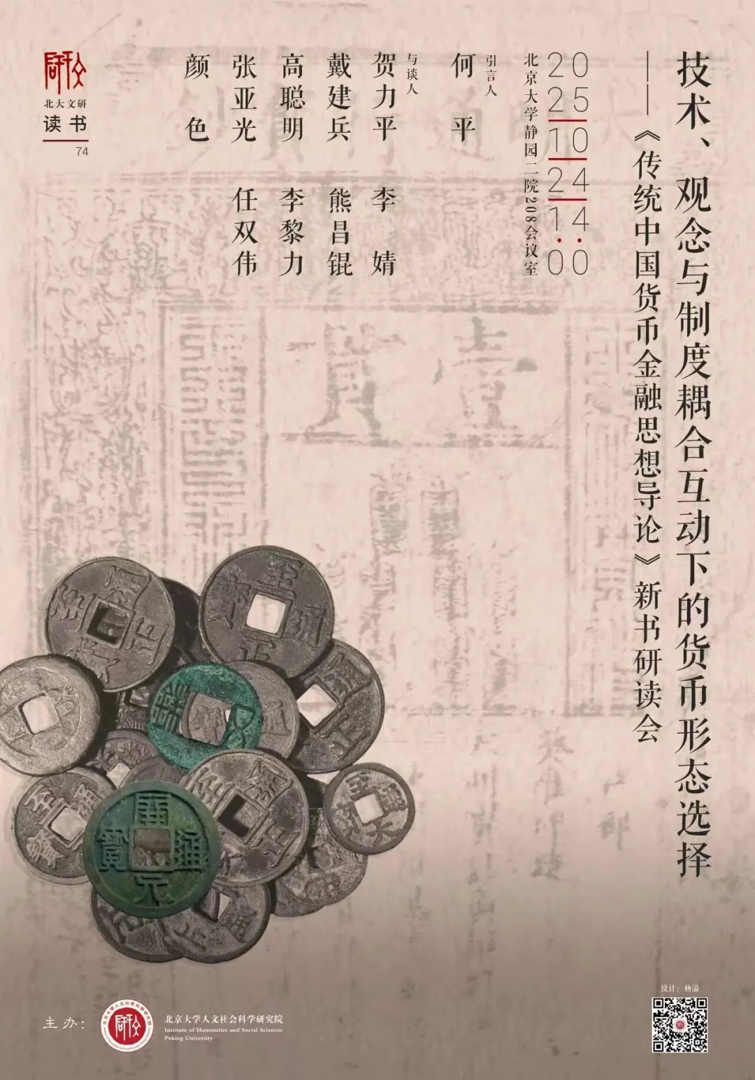 2025年10月24日,“文研读书”第74期在北京大学静园二院208会议室举行,主题为“技术、观念与制度耦合互动下的货币形态选择——《传统中国货币金融思想导论》新书研读会”。本次研读会的引言人为中国人民大学财政金融学院教授、《传统中国货币金融思想导论》作者何平,与谈人包括北京师范大学经济与工商管理学院教授贺力平、河北师范大学历史学院教授戴建兵、中国钱币博物馆研究员高聪明、北京大学经济学院长聘副教授张亚光、北京大学光华管理学院副教授颜色、首都经贸大学经济学院教授李婧、中国社会科学院经济研究所研究员熊昌锟、中国人民大学经济学院副教授李黎力、中国出版集团出版部职员任双伟。