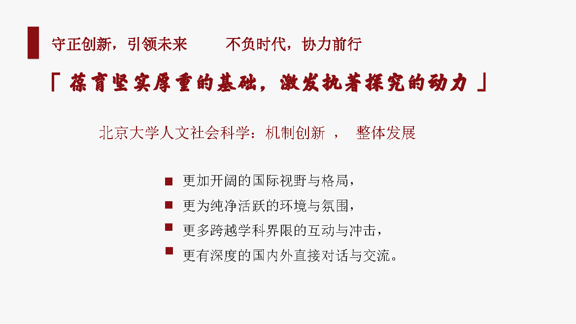 北大的人文社会科学有着深厚的专业传统,近年来,交叉学科勃然兴起,二者从根本上为整体发展提供了保证。在原有基础上谋求创新,需要更加开阔的视野与格局,也需要更有深度的国内外直接对话与交流。