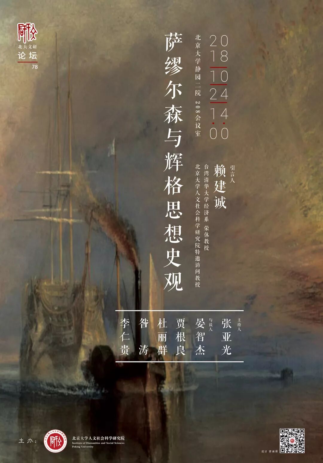 2018年10月24日下午,“北大文研论坛”第七十八期在北京大学静园二院208会议室举行,主题为“萨缪尔森与辉格思想史观”。文研院工作委员、北京大学经济学院副教授张亚光主持,文研院特邀访问教授、台湾清华大学经济学系荣休教授赖建诚作引言。北京大学经济学院教授晏智杰、杜丽群,中国人民大学经济学院教授贾根良,中国社会科学院经济研究所研究员李仁贵,北京大学历史学系副教授昝涛出席并参与讨论。
