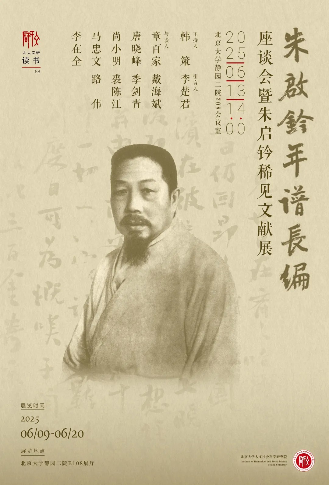 2025年6月13日,“文研读书”第68期《朱启钤年谱长编》座谈会在北京大学静园二院208会议室举行。座谈会由《朱启钤年谱长编》作者李楚君作引言,北京大学历史学系长聘副教授韩策主持,原中共中央党史研究室副主任章百家及其夫人李南、北京大学城市环境学院教授唐晓峰、北京大学历史学系教授尚小明、中国社科院近代史研究所研究员马忠文、中国社科院近代史研究所研究员李在全、复旦大学历史系教授戴海斌、北京大学中文系长聘副教授季剑青、华东师范大学历史学系副教授裘陈江、浙江古籍出版社副总编辑路伟与谈。