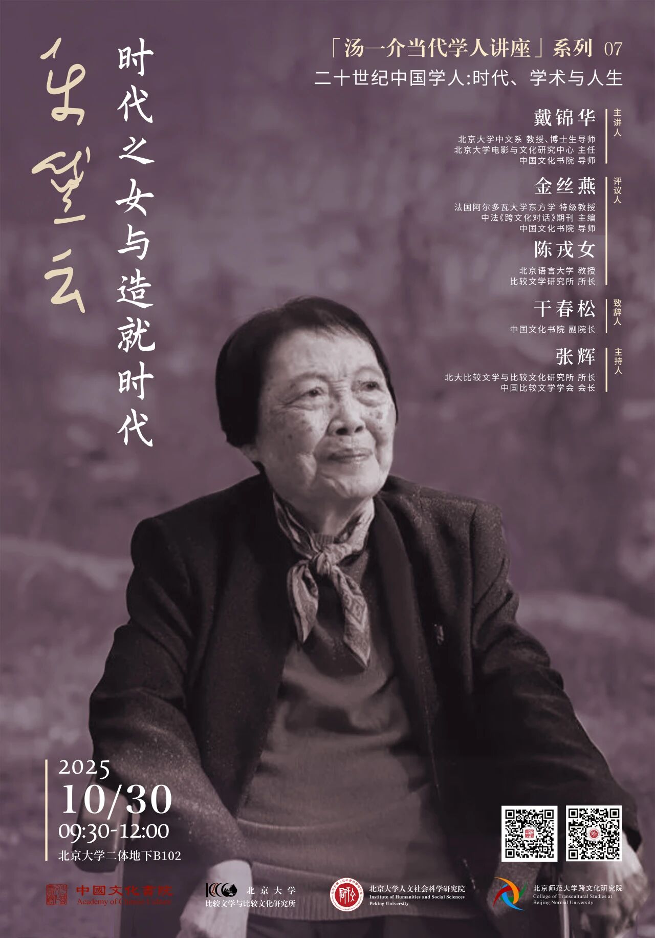 为纪念乐黛云先生,中国文化书院携手北京大学比较文学与比较文化研究所、北京大学人文社会科学研究院、北京师范大学跨文化研究院共同主办“汤一介当代学人讲座”第七讲暨《汤一介当代学人讲座文集》新书发布会。本次讲座将由北京大学比较文学与比较文化研究所所长、中国比较文学学会会长张辉教授主持,中国文化书院副院长干春松教授致辞,中国文化书院导师、北京大学中文系戴锦华教授主讲,中国文化书院导师、法国阿尔图瓦大学外国语学院东方学系金丝燕教授,以及北京语言大学比较文学研究所所长陈戎女教授评议。