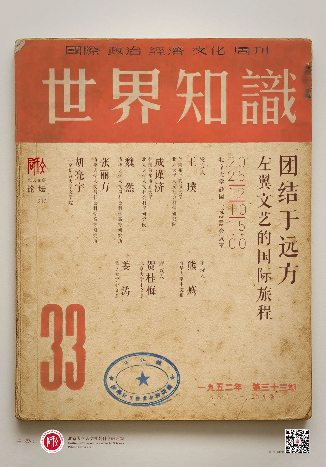二十世纪,中国、亚洲、非洲、拉丁美洲的许多左翼作家、艺术家、社会运动人士都曾出发远行,“走异路,寻求别样的人们”。同时,介入各自国族现实的文艺,也往往通过向“远方”学习、和“远方”交互来实现形式创新。这种种旅程和流动性,超越了西方资本主义所规定的“自我-他者”“中心-边缘”模式,创造着“团结于远方”的经验联动。然而,这份二十世纪的遗产,后来遭到系统性遗忘。本次论坛,从旅行书写、文艺新变、思想交互、历史记忆等方面出发,试图重访乃至重绘左翼文艺的国际路线图。